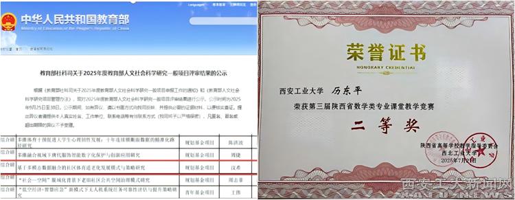 1名教师成功获批2025年度教育部人文社会科学研究项目,1名教师在第三届陕西省高校数学类专业课堂教学竞赛中获二等奖。推荐1名教师成功申报陕西省青年科技新星,推荐2016届校友入选陕西省2024-2025年度“高校毕业生基层就业卓越奖学(教)金”候选人。学生在2025年陕西省第四十四届大学生田径运动会上成功斩获银、铜两枚奖牌并打破多项校级纪录。