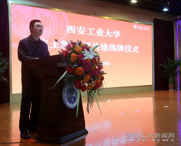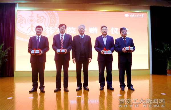西安工业大学校长雷亚萍为芮筱亭院士颁发了聘书,芮筱亭院士向中国兵器工业集团西北兵工局和学校赠书。中国兵器工业集团西北兵工局和我校签署共建协议,并举行了揭牌仪式。