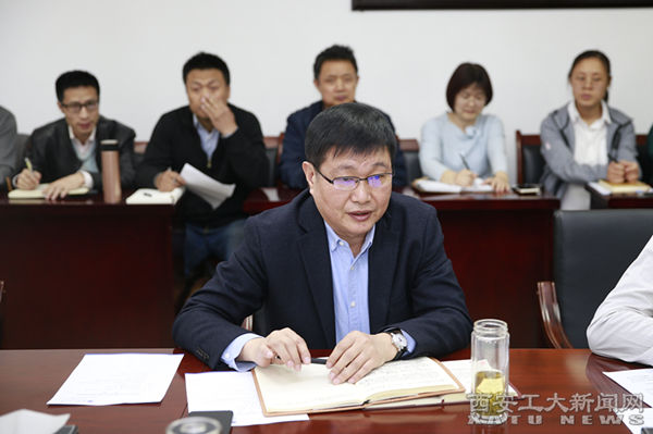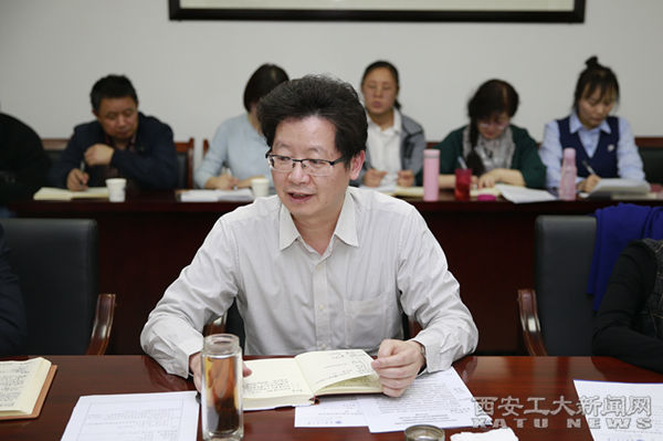 王军周在会上领学习近平总书记在学校思想政治理论课教师座谈会上的重要讲话精神。