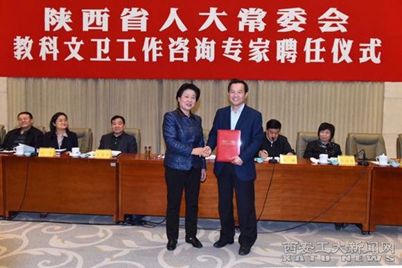 (本网讯)近日,陕西省十三届人大常委会教科文卫工作咨询专家聘任会隆重举行,我校李建平教授与省内其他47名专家接受聘任。全国人大常委会委员、陕西省人大常委会副主任朱静芝向各位咨询专家颁发了聘书,并作重要讲话。