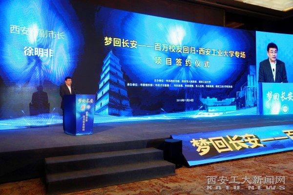 (本网讯)11月24日,由西安市委市政府和我校主办的“梦回长安——百万校友回归”西安工业大学专场活动在曲江凯悦酒店举行。陕西省委常委、西安市委书记王永康,市领导高杲、杨晓东、韩宝生、徐明非、李佐成,西咸新区管委会主任康军,我校党委书记刘卫国、校长雷亚萍,校领导于孟晨、吴介军、郑建山、赵红星、陈桦、刘发林、刘卜、任海鹏和段小存出席活动。签约仪式由副市长徐明非主持。