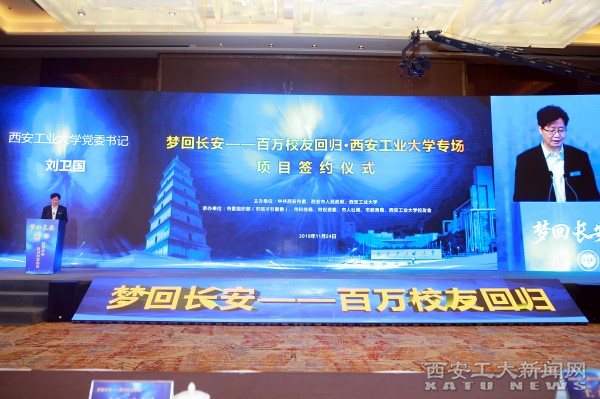 刘卫国致辞并发表校友回归振兴大西安的倡议。他表示,校因城而立、城因校而兴。建校63年来,西安工业大学在自身发展的同时,主动融入大西安的建设,不断做好人才培养工作,为西安在兵器制造、材料化工、机械制造、基础建设、文化传播等方面做出了积极的贡献。刘卫国号召校友们优先选择到西安创新创业,抓紧大西安发展机遇,将更多人才、企业、资金引来西安、落地西安,为西安“追赶超越”锦上添花。刘卫国说,西安市委、市政府出台的一系列改革创新政策措施为学校发展和学生校友就业创业提供了良好环境和广阔空间。我们将践行“城市+校友+学校”发展模式,充分发挥学校优势,广泛凝聚校友力量,推动西安、母校、校友共赢发展。
