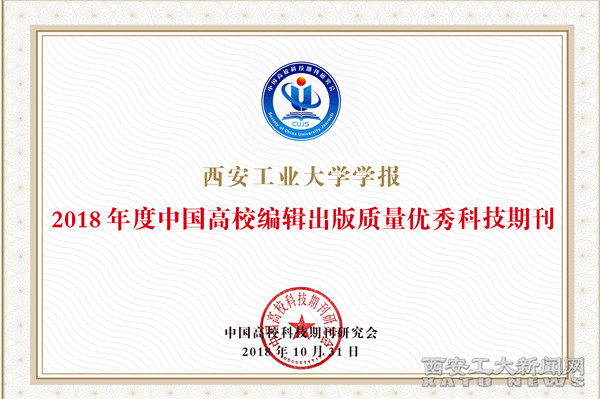 (本网讯)近日,中国高校科技期刊研究会第22次学术年会发布了2018年度高校杰出•百佳•优秀科技期刊遴选结果,我校主办的《西安工业大学学报》被评选为2018年度中国高校编辑出版质量优秀科技期刊。学报编辑部主任苏俊宏参加了本次会议并接受了大会颁发的证书。