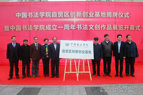 (本网讯)11月5日下午,在陕西省教育厅、陕西省自贸办、西安市自贸办的指导下,西安国际港务区管委会、西安工业大学与西安国际陆港投资发展集团有限公司在我校未央校区联合举办了中国书法学院自贸区创新创业基地揭牌仪式暨中国书法学院成立一周年书法文创作品展览开幕式。