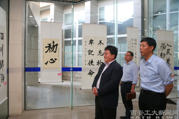 (本网讯)5月3日,由统战部组织,中国书法学院、工会共同承办的纪念中共中央发布“五一口号”七十周年书法作品展在未央校区图书馆举办,校党委副书记于孟晨参观书法展,并指导工作。