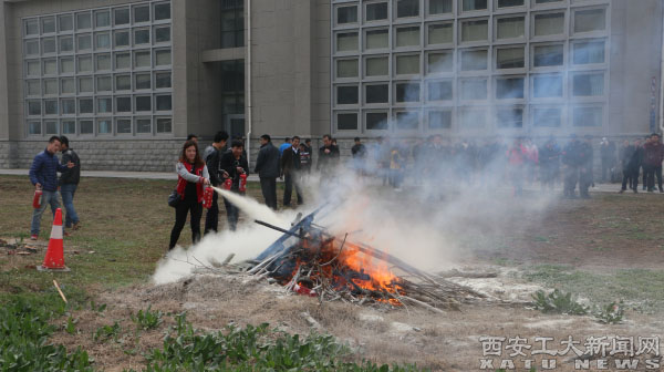 在消防演练现场,保卫处处长李有良对灭火操作的注意事项进行了补充讲解,商户五人一组轮流进行了实战灭火演练,大明宫建材市场在消防人员和器材方面也给予了友情赞助。
