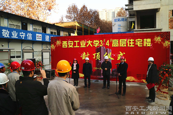 (本网讯)12月6日上午,我校金花校区3#、4#高层住宅楼及地下车库工程主体封顶仪式举行。校长刘卫国、总会计师段小存,学校相关职能部门负责人、教职工代表、基建处工作人员,以及施工单位、监理单位的负责人,现场施工人员等参加封顶仪式。