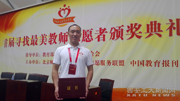 (本网讯)近日,西安工大附小贺中彬老师从全国500多名参评志愿者中脱颖而出,获得由北京师范大学、全国教师志愿服务联盟、中国教育报主办,中国志愿者服务联合会指导的“首届寻找最美教师志愿者”提名奖,并受邀赴北京参加了颁奖典礼。