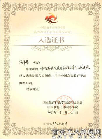 (本网讯)根据中国教育干部网络学院6月5日签发的入选证书,我校人文学院院长、陕西当代文学与艺术研究中心主任冯希哲教授所主讲的《伦理道德传统与社会主义道德文化建设》专题报告入选全国高等教育干部培训课程资源库,用于全国高等教育干部网络培训。