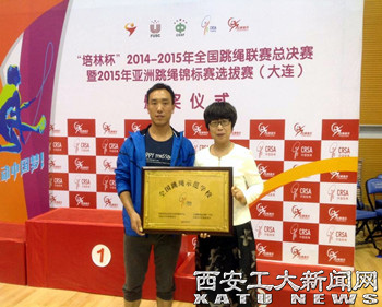(本网讯)5月13日至17日,在辽宁大连举行的2014-2015年度“培林杯”全国跳绳联赛总决赛暨2015年亚洲跳绳锦标赛选拔赛和第一届全国“科学跳绳校园行”校长论坛上,西安工大附小由于在跳绳运动的开展和推广中成绩突出,被国家体育总局社会体育指导中心、全国跳绳运动推广中心授予“全国跳绳示范学校”,附小代表队也在比赛中再创佳绩。