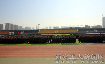 庄严且肃穆,伴随着电信学院2012级侯龙飞同学领颂《高等学校学生行为准则》,西安工业大学办学传统、校训,新生们整齐嘹亮诵读着 “忠诚进取,精工博艺”,“敦德励学,知行相长”的声音在操场上回荡,这正是4700余名新生对于未来最响亮的承诺。