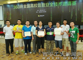(本网讯)近日,从2013年360杯全国高校信息安全技术大赛上传来喜讯,我校代表队再创佳绩。由计算机学院梁向阳、喻钧、徐江涛等三位老师带队及6名学生组成两支参赛队伍,其中,1队获一等奖,2队获二等奖,西安工业大学获“优秀高校组织奖”。