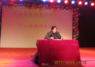 (本网讯)12月20日下午,西安工业大学继续教育学院邀请田亮教授在我校函授站西安机电信息技师学院作了十八大精神宣讲报告,西安机电信息技师学院师生300余人以及继续教育学院中心组成员参加了报告会。