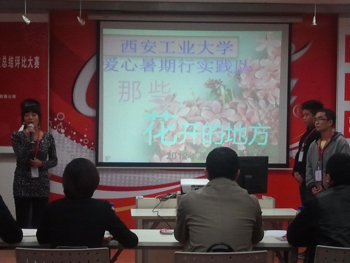 “牵手阳光”大学生骨干义务支教活动是由共青团陕西省委员会和西安中萃可口可乐饮料有限公司联合举办的公益性活动,旨在提高大学生骨干素质,鼓励大学生骨干积极参与公益事业。本次活动共有西安工业大学、陕西师范大学、西安建筑科技大学在内的8所高校参加。我校爱心暑期行队通过细致的讲解、真实精美的PPT详细介绍了他们在蓝田县九间房乡李家坪小学的支教生活,展示了我校青年学子不怕吃苦,不畏艰辛,扎根深山无私奉献的精神风貌,得到了评委和兄弟高校师生们的一致好评,最终获得“优秀教学奖”。