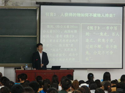 潘怀平博士从三个方面对物权保护作了详实的讲解与分析。一、人人享有物权,物权是人权的保障形式;二、物权受到法律保护,并且是平等保护;三、加大物权的“刑法”保护力度,严惩“打砸抢烧”的行为。讲座中潘怀平博士运用诙谐幽默的语言、丰富的具体案例、大量的法律条款,并结合当前社会热点对物权保护作了全面细致的解读,最后还特别强调了犯罪的法律后果。