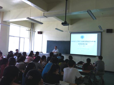 严文教授以“我校材化学院和国家材料科学10年规划”为题,向同学们简要地介绍了材化学院的历史与现状和材料科学与工程的相关知识,还讲述了西安工业大学的发展史;西安工业大学硕士研究生学位授予;21世纪材料科学与工程前景以及材料在人类发展史中的作用等问题。期间,严老师睿智风趣的语言赢得了同学们的阵阵掌声。