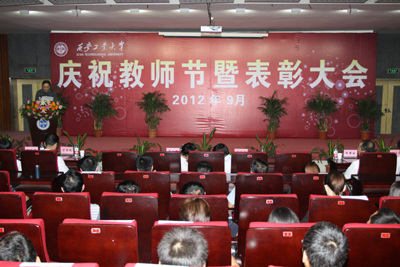 (本网讯)西安工业大学2012年庆祝教师节暨表彰大会于9月6日下午在未央校区图书馆报告厅举行。全体校领导和各单位负责人以及受上级与学校表彰的先进个人、教师代表、学生代表、新入校人员400余人参加了大会,大会由校党委副书记于孟晨主持。