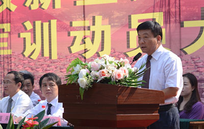 简林根作军训动员报告,他代表学院对第二炮兵工程大学承训官兵表示热烈欢迎,并对全体参训师生致以亲切问候。他指出:军训是我院教学计划的组成部分,是对学生进行全面素质教育的重要内容。希望同学们,在训练中深刻体会大学生军训的意义,服从教官指挥,虚心向教官学习。同时要求全体教官发扬部队优良作风,高标准、严要求、科学施训。全体参训干部坚持“以学生为本,树立管理育人、服务育人、环境育人、军训育人”的理念,训育结合,注重培养学生积极健康的思想情操,坚定不移的政治信念,爱国卫国的牺牲精神。他预祝北信学院2012级学生军训圆满成功。