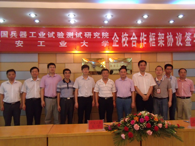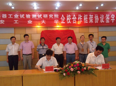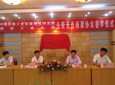 刘卫国副校长、田建明副院长分别代表双方签署了框架合作协议,双方主要领导见证了签字仪式。签字仪式后双方共同揭牌,标志着西安工业大学人才创新培养基地及兵器试验测试技术研究中心正式成立。