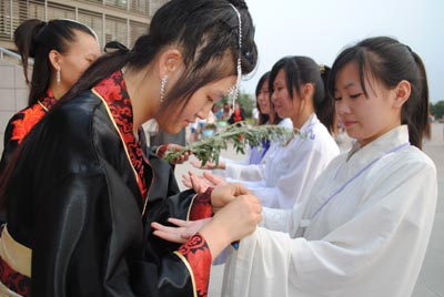 祭祀屈原典礼仪式在身穿汉朝祭祀礼服赞礼的宣布中正式开始,三位主祭和六位执事分别完成了进位,宾盥,上香,进奠币,三献礼(初献,亚献和终献)宣读祭文,退班等一系列的祭祀流程。庄严肃穆的祭祀典礼使现场充满了浓浓的传统文化气息,让现场观众深深感触和了解到端午节的民俗传统文化。紧接着开展兰汤祓禊环节,身着汉服的主礼手持菖蒲,在铜盆沾水后向同学洗礼祈福。整个仪式在射五毒,斗蛋,投壶,包粽子等传统文化活动体验中圆满结束。