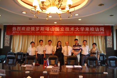 在会谈中,路金龙处长首先向代表团各位的莅临表示欢迎,并对我校的发展和现状做了详细介绍。坚增运副院长介绍了材料与化工学院的学科建设和研究方向。喀山国立技术研究大学代表亚历山大副教授介绍了学校相关情况和校际间教师、学生交流与合作等事宜。路金龙处长、坚增运副院长代表学校向俄罗斯客人赠送了礼品并合影留念。随后代表团一行参观了材化学院实验室。