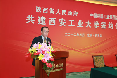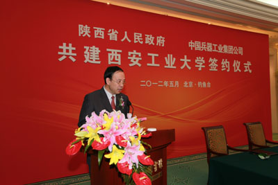 陕西省教育厅厅长杨希文在致辞指出:陕西省人民政府与中国兵器工业集团公司共建西安工业大学,这是学校和我省高等教育改革发展进程中的大事、喜事。长期以来,西安工业大学紧紧围绕地方经济建设和国防工业发展的需要,培养了大批具有创新精神和实践能力的高素质人才,形成了良好的办学传统,为国家兵器工业和陕西经济社会发展作出了重要贡献。我省高度重视西安工业大学的建设和发展,重点支持博士学位授权学科建设,大力支持化解新校区建设债务,“十二五”期间将投入1.5亿元支持学校建成省属高水平大学。此次战略合作协议的签署,必将为学校提供难得的发展机遇,希望学校突出办学特色,着力提高教育质量,提升核心竞争力、科技贡献率和社会影响力。