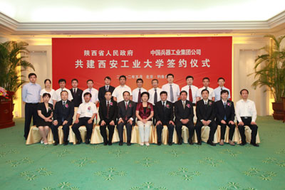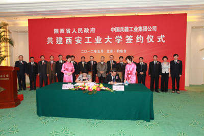 (本网讯)5月22日上午,陕西省人民政府、中国兵器工业集团公司共建西安工业大学签约仪式在北京钓鱼台国宾馆隆重举行。陕西省人民政府副省长朱静芝、中国兵器工业集团公司副总经理曾毅签署了共建西安工业大学的协议。