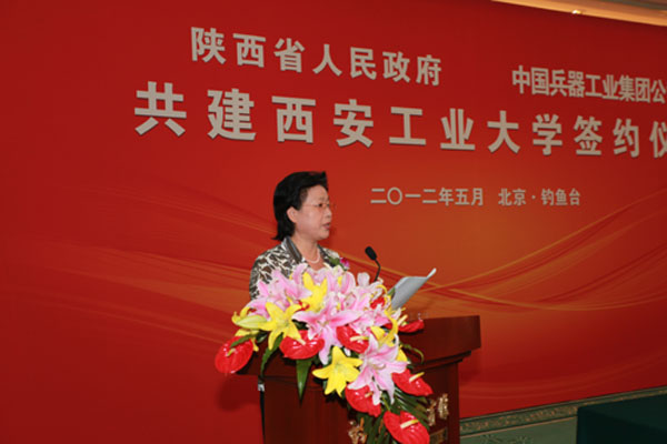 陕西省人民政府副省长朱静芝做了重要讲话,她指出,西安工业大学作为国家部署在西北地区服务兵器行业的高等学校,始终坚持为区域经济社会发展和国防工业服务的宗旨,与在陕兵工企事业单位、科研院所保持着密切的学、产、研合作关系。此次战略合作协议的签署,必将为学校提供难得的发展机遇和更加广阔的发展空间。陕西省将一如既往地支持中国兵器工业集团公司在陕西的发展,一如既往地支持西安工业大学的发展建设。希望西安工业大学以共建为契机,充分发挥行业优势,进一步密切校企合作,全面提高人才培养、科学研究、社会服务和科技创新能力,不断提升学校在兵工行业科技创新的示范带动作用,为国防工业的发展,为经济社会发展做出新的更大的贡献。