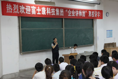 5月19日上午,富士康科技集团“企业讲师团”还面向全校师生代表做了两场专题讲座。郑光杰副总及专班主管从企业概况、发展战略、技术前沿等方面为师生作报告。现场互动热烈,郑光杰副总对师生的问题一一予以解答,赢得阵阵掌声,取得了良好效果。