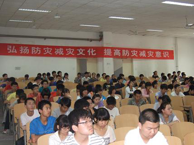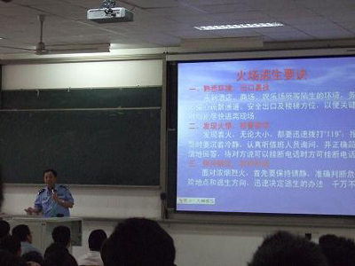 杨科长首先联系实际,阐述了加强大学生安全管理的必要性和紧迫性,指导大家如何正确看待学校的大学生安全管理工作,带领大家学习了我校近年来出台的有关大学生安全管理及消防、交通管理的相关文件,使大家对我校的有关安全管理制度有了较深刻的认识。讲座中,杨科长还介绍了大学生遇火灾和地震逃生的自救方法、如何正确使用灭火器、以及树立安全防灾减灾意识的重要性等。最后杨科长强调安全工作还需要全体师生的支持,希望在座的每一位同学积极的做好防灾减灾安全知识的宣传,积极的参与到我校的稳定安全工作当中来,携起手来一起营造一个良好的学习、工作和生活环境。