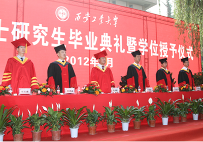 (本网讯)5月10日上午,2012届硕士研究生毕业典礼暨学位授予仪式在西安工业大学金花校区喷泉广场隆重举行。校长廉振民,党委副书记丁养斌,纪委书记许尚年,副校长张君安、刘建勋、刘卫国出席了典礼,各院(部)硕士研究生导师代表、研究生部全体人员、2012届硕士毕业生、2010级在校研究生代表参加了毕业典礼。典礼由研究生部主任雷亚萍主持。