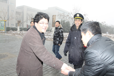 (本网讯)龙年春节前夕,西安工业大学党委副书记于孟晨带领校工会一行冒雪来到未央校区,代表学校亲切看望了寒假期间仍坚守在工作一线的保卫处、后勤集团、基建处的职工,表达对他们的问候和新年祝福,并给他们送去了慰问品。