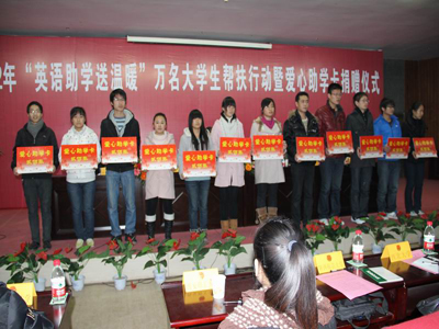 四海嘉华科技有限公司(嘉学网)总裁文小红讲话,他说:“他非常理解英语水平较低对一名大学生综合素质和能力发展的限制,联合共青团陕西省委举办这样的活动,他们正好有能力参加进来帮助大家也是他们非常高兴的。”最后,团省委副书记张小平作了总结讲话。他感谢四海嘉华科技有限公司的捐助和各高校团委的支持,使这次送温暖工作顺利开展,也希望所有受到帮助的学生努力学习,充分合理的利用好这些助学卡提高成绩回报社会。