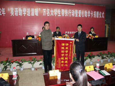 (本网讯)12月30日,共青团陕西省委“英语助学送温暖”万名大学生帮扶行动暨爱心助学卡捐赠仪式在西安工业大学未央校区举行。团省委副书记张小平、校党委副书记丁养斌、省学联副秘书长辛磊、校团委书记赵琼、四海嘉华科技有限公司(嘉学网)总裁文小红等出席。陕西科技大学、西安医学院、西安工程大学等全省二十多所高校的学生近400人参加了捐赠仪式。团省委学校部部长、省学联秘书长单舒平主持了捐赠仪式。