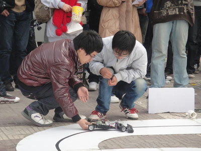 此次比赛分为三个区域。首先,展示区为大家展示了在全国“飞思卡尔”杯智能车大赛中的获奖作品,有电磁式、摄像头式及光电式循迹车。其次,体验区有专门配备好的电器设备来供同学们自己动手操作,使同学们亲自体验到焊接电路板,用吸锡器剔除焊接错误的别样乐趣,与此同时,电信科协的技术人员进行了专业的指导和讲解,操作不得当的地方予以正确改正,为同学们提供了许多帮助。最激动人心的热点赛区就是本次比赛的竞赛区。参赛选手通过分组,每组有三次试跑的机会,最终取最短的完整通过一圈时间作为最佳最终成绩。经过一轮又一轮的激烈比赛,来自2011级徐堂果同学以单圈20.31秒的好成绩取得了本次循迹车大赛的一等奖。在比赛末,来自全国比赛获奖的光电式循迹车与摄像头式循迹车进行了激烈追逐表演赛。
