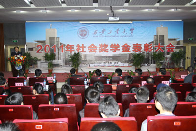 (本网讯)11月18日,西安工业大学2011年社会奖学金表彰大会在图书馆报告厅举行。中国兵器工业西北兵工局局长刘建民及各设奖单位有关领导应邀出席了大会,校党委书记赛云秀、校长廉振民、校党委副书记丁养斌、纪委书记许尚年、副校长刘建勋、刘卫国、总会计师段小存出席大会。党办校办、组织部、宣传部、学生处、教务处、团委、研究生部、国际交流与对外合作处、后勤集团、保卫处等部门负责人,各学院党委(党总支)书记(副书记)、雁塔校区、工业中心有关领导,以及辅导员、学生代表等参加了大会。