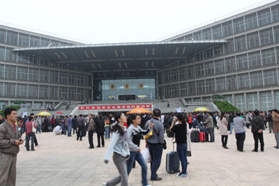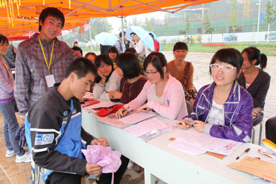 各院系亮眼的迎接亭也都在经纬广场两侧整齐地排成两列,志愿者们耐心周到的服务受到了新生及新生家长的高度好评。保卫处也在新生报到期间开放门禁,特别为前来报到的自驾车留出从学校西大门到经纬广场前的空地免费停车。在图书馆大厅,学校集中设置了招生办公室咨询处、新生缴费处、户籍办理处、新生绿色通道办理处等以便前来报到的新同学能在一个地点完成多个报到手续。