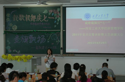 (本网讯)在中国共产党建党90周年来临之际, 6月29日上午,西安工业大学经济管理学院党委在未央校区举行了以“载歌载舞庆‘七一’”为主题的党员宣誓、表彰暨文艺表演大会。学院全体党委成员,教工党员和学生党员共200余人参加了本次活动。