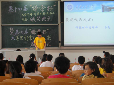 随后,团委赵伟奇宣读了《关于第十四届“探索杯” 西安工业大学大学生课外学术科技作品竞赛的通报》,同时对各获奖团队进行了颁奖;获奖学生代表马亮,李随萌,马莎莎三位分别从科技发明制作、自然科学类学术论文、哲学社科类调查报告等三类作品的不同角度,结合自己参赛经历,从团结、责任、收获等方面进行了发言,鼓励广大同学积极参与学生科技竞赛中来,锻炼、检验和提高自己。