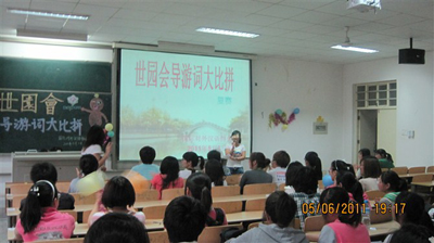 在“文学娱乐周”版块,结合所学专业与时事政治与重大事件,演讲与口才协会举办了建党90周年诗歌朗诵大赛、国际对外汉语协会举办迎世园导游词比拼,法律联合会举办模拟法庭等众多活动吸引了大批同学。