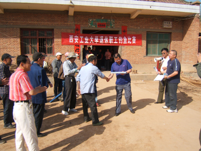 经过一个多小时的奔波来到了位于蓝田的厚镇水库,在这里举行今年的钓鱼比赛。离退办副主任刘晓青强调了安全问题,退休科长崔志安宣布了比赛规则。之后老同志们很快便投入到钓鱼比赛之中。他们钓技娴熟,个个精神抖擞,容光焕发。各位参赛者凝神静气、不急不躁、耐心守候在自己的钓竿旁边,不久,竿动标沉,一条条经不住诱惑的鱼儿纷纷上钩,大家战果颇丰。