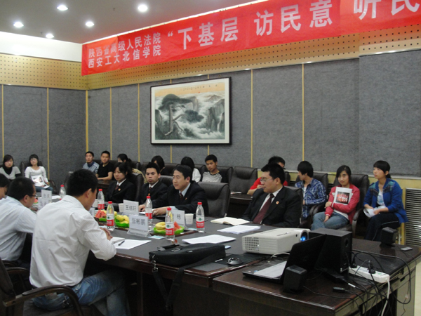 随后,与会师生就法院在“平安西安”建设中所发挥的作用、如何预防犯罪尤其是青少年违法犯罪、民事诉讼案件判决后的执行情况、劳资争议的解决办法、民意与法律的统一、审判监督及陪审群众代表性等关心的问题与法官们进行了气氛热烈的交流。