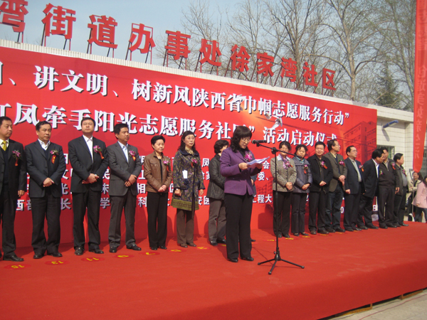 (本网讯)3月26日,由陕西省妇联、陕西省文明办、陕西省红凤工程志愿者协会、西安阳光医院主办,未央区文明办、民政局、卫生局、妇联、徐家湾街道党工委、办事处协办,西安阳光医院、未央区相关社区等联合举办的“迎世园、讲文明、树新风陕西省巾帼志愿服务行动”暨“红凤牵手阳光志愿服务社区”活动启动仪式在未央区徐家湾街道办举行,西安工业大学 30余名师生应邀参加了此次活动。