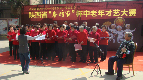 (本网讯) 3月12日,由陕西省老龄委、陕西省妇联主办,陕西省慈善协会协办,陕西老蜂农生物科技有限公司承办的关爱中老年人精神生活的爱心公益活动,-----陕西省“老蜂农”杯中老年才艺大赛优秀节目选拔赛在西安工业大学东家属区举行。活动旨在弘扬尊老、爱老、助老、养老的中华传统美德和快乐、健康、长寿的生活理念,构建和谐社会,同时为中老年人创造了一个以丰富中老年人精神生活的文化艺术平台,从而改善了中老年人的生活方式、提高了生活质量,使他们分享到健康快乐的美好生活。
