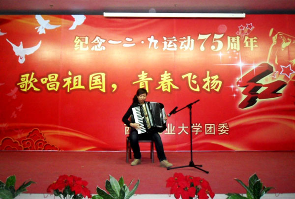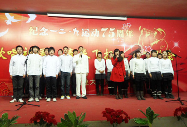 (本网讯)12月8日晚,西安工业大学团委在未央校区举办纪念“一二·九运动”75周年——“歌唱祖国 青春飞扬”红歌会。之前,校团委宣传部对来自不同院系、不同年级的30余个报名的曲目,进行了初审、复审等环节,最终挑选了14个优秀的表演团队及个人登台演唱。