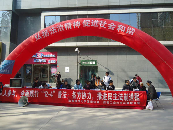 (本网讯)12月4日 ,在全国第十个法制宣传日到来之际,西安工业大学和陕西科技大学法律联合会联合举办的“12.4—弘扬法制,关注生活”普法活动在西安未央区红旗厂街区举行。