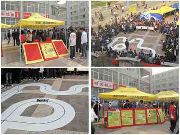 比赛活动场地分为四个区域,分别是比赛区、宣传区、体验区和科普知识问答区。参赛各队制作一个能够自主识别道路的模型汽车,在比赛区按照规定路线行进,以完成时间最短者为优胜。宣传区通过深入浅出的方法,介绍了循迹车的原理,其中着重介绍了传感器、单片机和一些常用的电学元器件。通过体验区和科普知识问答区的亲身感受,同学们进一步了解了循迹车知识。大赛中,学生将平时学习的理论知识应用到实际中,在应用中发现问题,并解决问题,进而将理论与实际进行了有效的融合,增强了学习专业知识的意识,