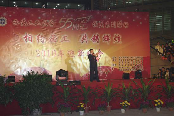 (本网讯)为喜迎建校55周年与2010级新同学,10月17号晚,由校团委主办的西安工业大学55周年校庆系列活动之“相约西工 共铸辉煌”2010年迎新晚会在未央校区隆重举行。校党委书记赛云秀、副校长张君安、校党委副书记丁养斌、校党委副书记于孟晨、副校长陈桦以及党办校办、党委组织部、党委宣传部、教务处、学生处、雁塔校区、北信学院等部门领导,以及各院(系)分党委(党总支)书记、新生辅导员老师与我校5000余名新生一同观看了晚会。