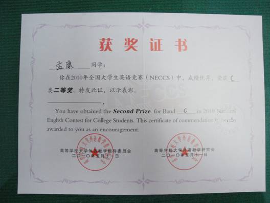 (本网讯)西安工业大学计算机学院08级信息对抗专业学生孟康同学,由院系推荐,经过了层层选拔参加了2010年全国大学生英语竞赛(NECCS),荣获C类二等奖。