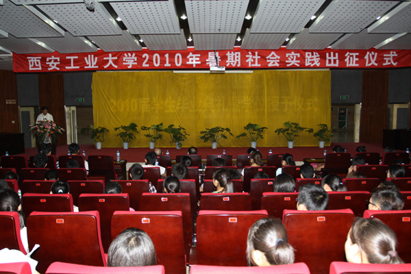 (本网讯)7月2日下午,西安工业大学2010年暑期社会实践出征仪式在未央校区图书馆一楼报告厅举行。党委副书记丁养斌出席仪式,教务处、学生处、团委等部门领导及全校各院系团总支书记和300余名实践队员参加了仪式。出征仪式由团委副书记赵琼主持。